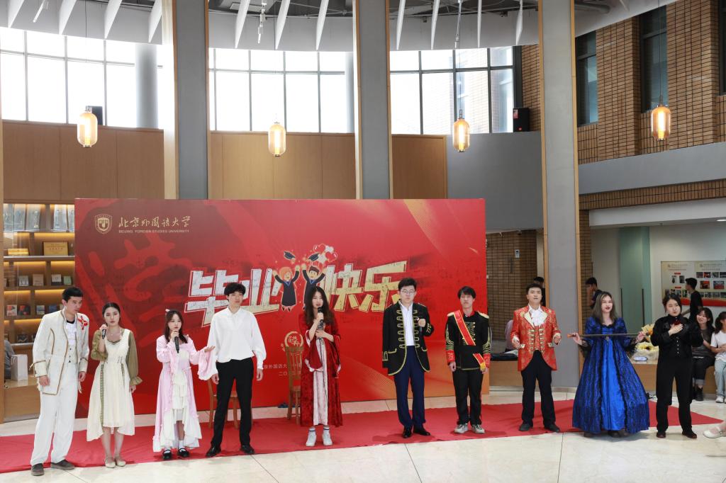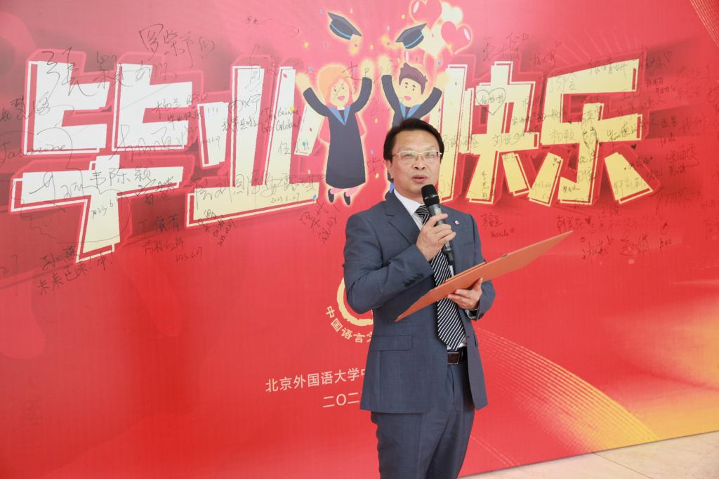 而后,在校本科生代表朱绚霖与研究生代表郭馨上台发言。朱绚霖同学表达了对各位毕业学姐学长的真诚祝福,也期望学长学姐常回“家”看看。郭馨同学用“最初起点”、“旅途记忆”、“终点亦是起点”三个词组回望了各位毕业生在北外中文的青春岁月,真诚祝愿毕业的诸位学子拥有更灿烂的明天。