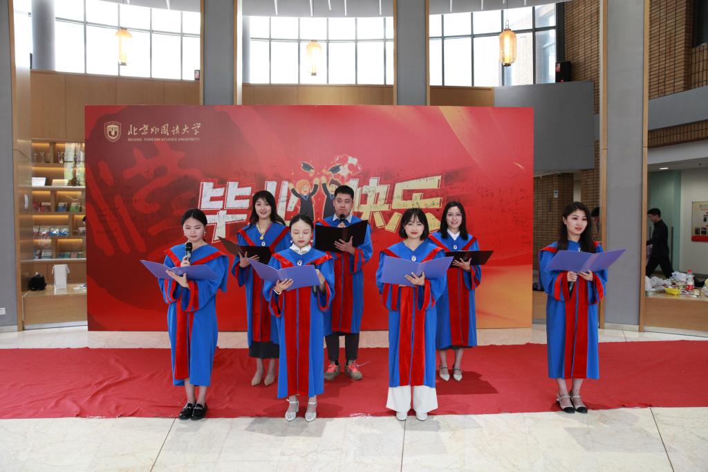 随后,本科毕业生代表王皓为与硕士毕业生代表马璐璐上台发言,王皓为同学回忆了在北外生活和北外中文课堂上的种种细节,从生活小事诗文释义到在课堂上与朋友们表演昆曲,并表达了与诸位老师同学相遇、与北外中文相遇的感恩之情;马璐璐同学回忆了自己初入北外时的场景,讲述了三年的学习经历与师生情谊,情到深处禁不住落泪哽咽。最后,她表示自己将谨承北外校训、不负北外期望,为人民服务、为社会服务。