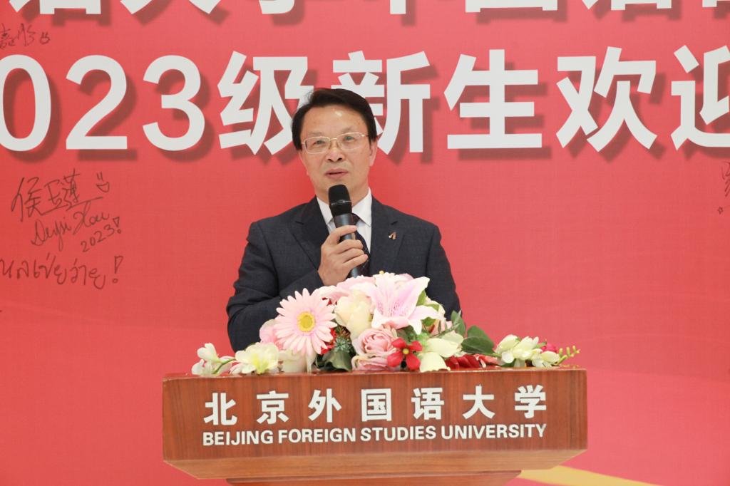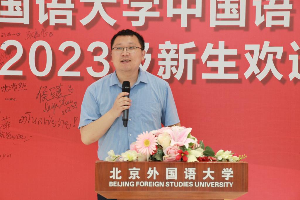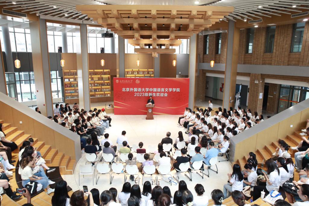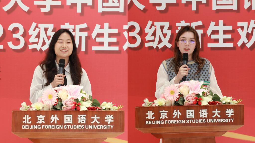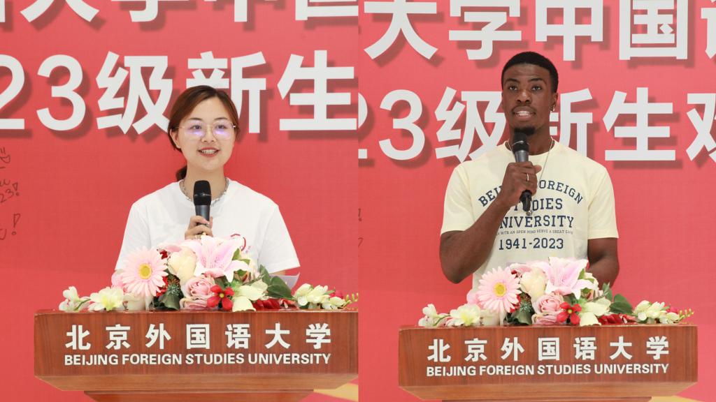 国歌缓缓响起,会场由签名时的欢声笑语转向庄严肃穆,迎新大会正式拉开帷幕。2023级中国本科生冯香涵、留学生后羿(来自喀麦隆)作为新生代表发言,字字句句折射出与北外中文学院邂逅的满心欢喜与前景展望。冯香涵同学提出以“归零心态”打开全新征程,并号召同学们将来能够用所学为国家为人民做点事情。后羿同学怀揣对中国与中文的热爱来到北外校园,追寻自己的梦想,以乐观的心态奔赴即将到来的大学生活,并期待将汉语文化带给世界。