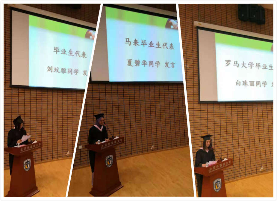 留学生办公室主任李冰在毕业典礼上致词,中文学院执行院长张晓慧为毕业生送上临别祝福。他们对同学们顺利毕业表示由衷祝贺,对同学们的未来寄予了热情的期待。