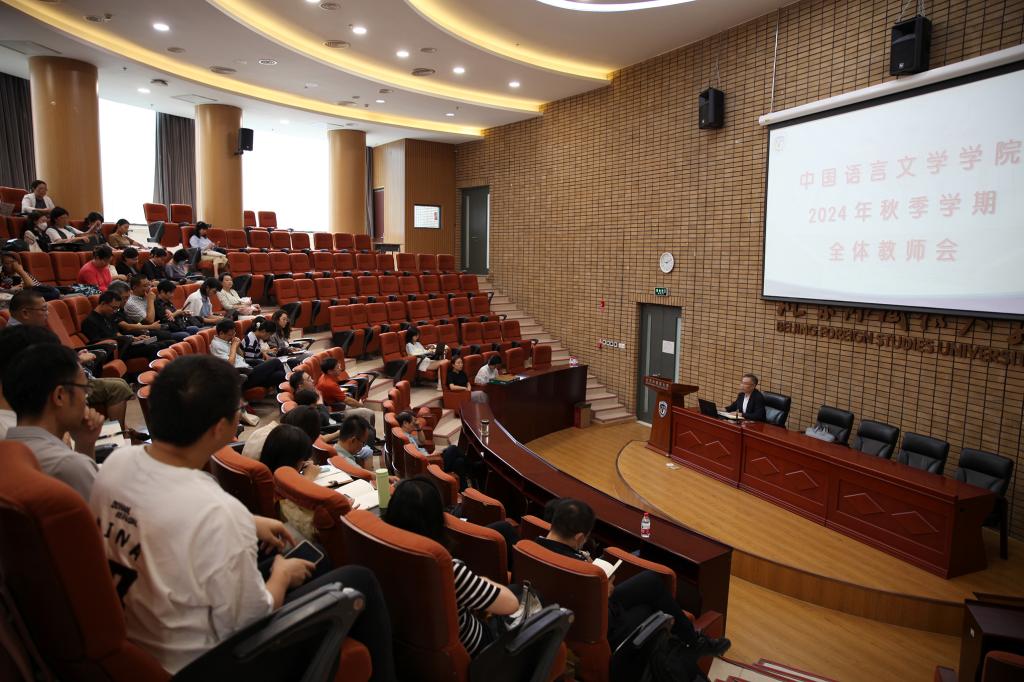 何辉重点传达了学校2024年秋季学期工作部署会上校党委书记王定华“乘势而上 善作善成,推动世界一流外国语大学建设迈上新台阶”讲话要旨,以及党委副书记、校长贾文键“加快一流学科体系建设 开创学校高质量发展新局面”专题报告精神,结合学院实际,号召全体教职员认真落实学校对新学期工作做出的各项重点要求及任务部署,学习贯彻党的二十届三中全会精神,坚持党建引领,推进学科建设、人才培养,紧抓机遇,共谋发展。随后,何辉传达了校党委关于《金年会jinnianhuicom教师政治把关和师德师风考核评价工作指南》《金年会jinnianhuicom关于进一步加强和改进教师党建和思想政治工作实施方案》的通知精神,简要总结学院暑期工作开展情况,对新入职教师表示欢迎,并对学院中国语言文学一级学科博士点成功获批表示祝贺,对近年来为博士点申报工作做出贡献的老师表达感谢。何辉再次强调安全工作的重要性,布置了新学期安全检查工作。
