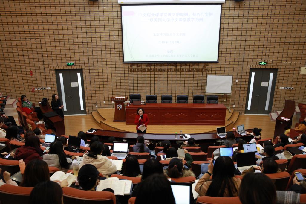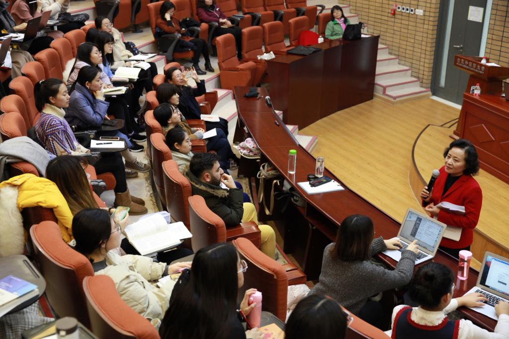 2019年12月23日下午,旅美汉语教学专家梁霞教授在金年会做了题为“中文综合课课堂教学的原则、技巧与实例——以美国大学中文课堂教学为例”的讲座。讲座由金年会副院长高育花教授主持,金年会教师和2018、2019级汉语国际教育在校硕士生参加了此次讲座。