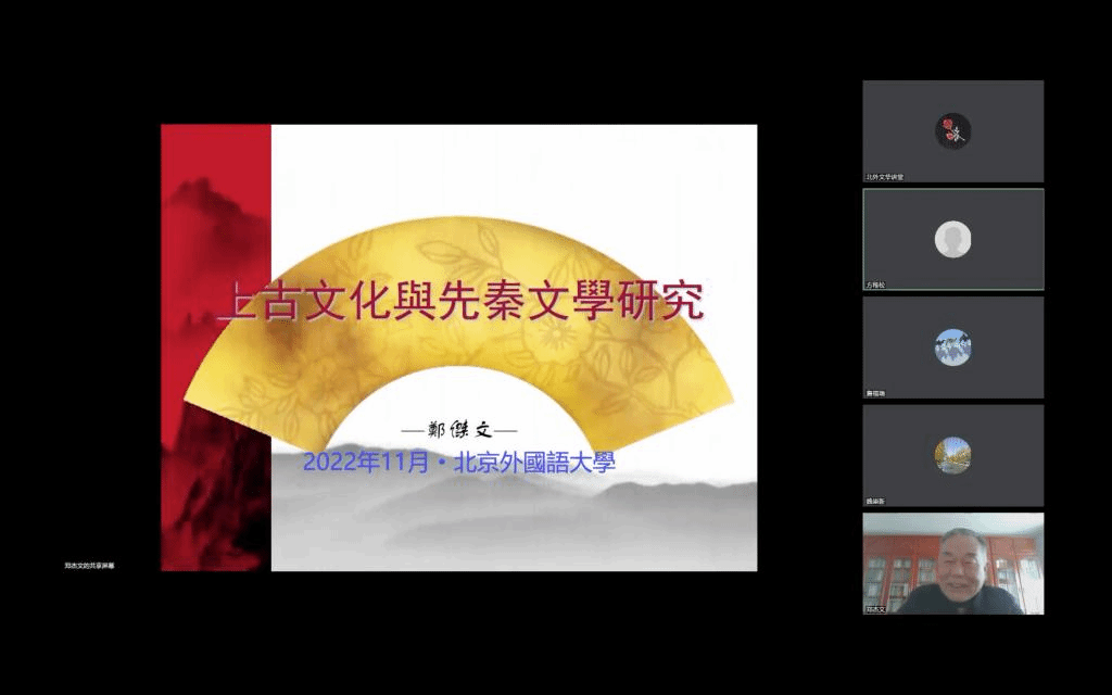 2022年11月10日下午,金年会jinnianhuicom举办“北外文华讲堂”系列讲座,邀请山东大学讲席教授、国家重点文化工程“全球汉籍合璧工程”首席专家郑杰文先生做题为《上古文化与先秦文学研究》的线上学术讲座。讲座由金年会诚信信誉至上魏崇新教授主持,金年会诚信信誉至上院长詹福瑞教授、副院长方稚松老师以及学院师生共一百余人参与此次讲座。
