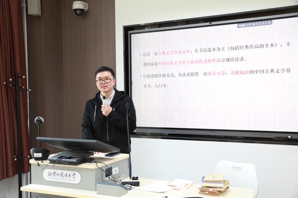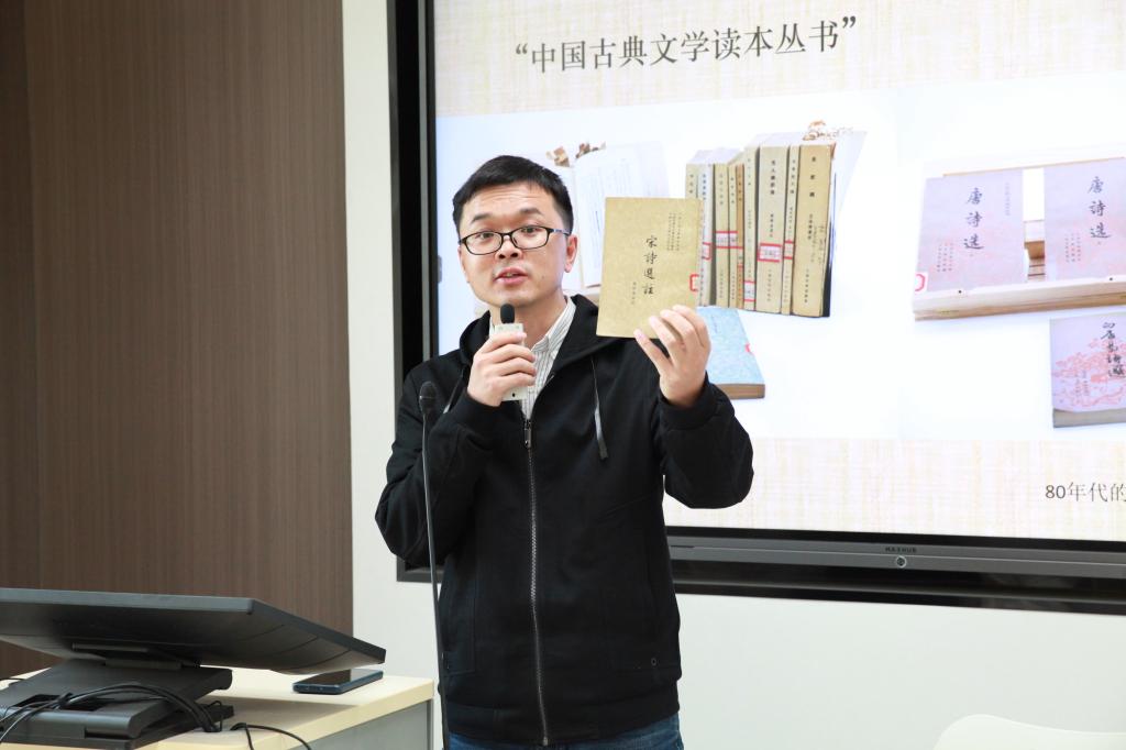 2023年4月12日下午,金年会诚信信誉至上中国古代文学研究所第4期学术沙龙在金年会jinnianhuicom中文楼219教室举行。人民文学出版社李俊编审带来“当代古典诗词选本的演进脉络——以‘中国古典文学读本丛书’为例”的主题分享。中文系主任、研究所副所长徐晓峰主持本次沙龙,研究所教师蒋文燕、周健强、罗静、青子文、吴娟,古代文学专业硕士研究生以及部分本科生出席并参与讨论。