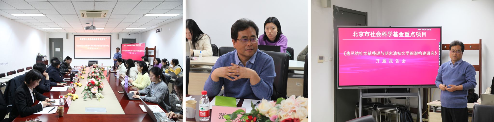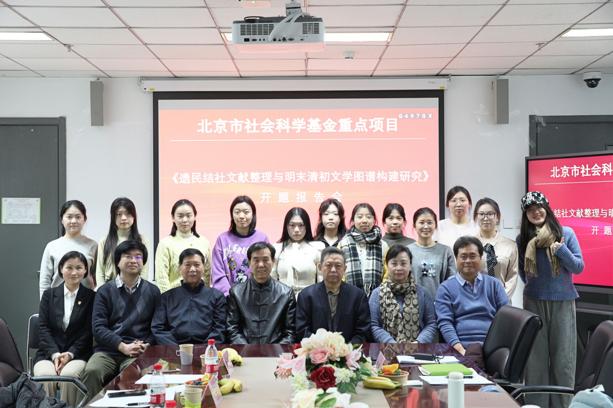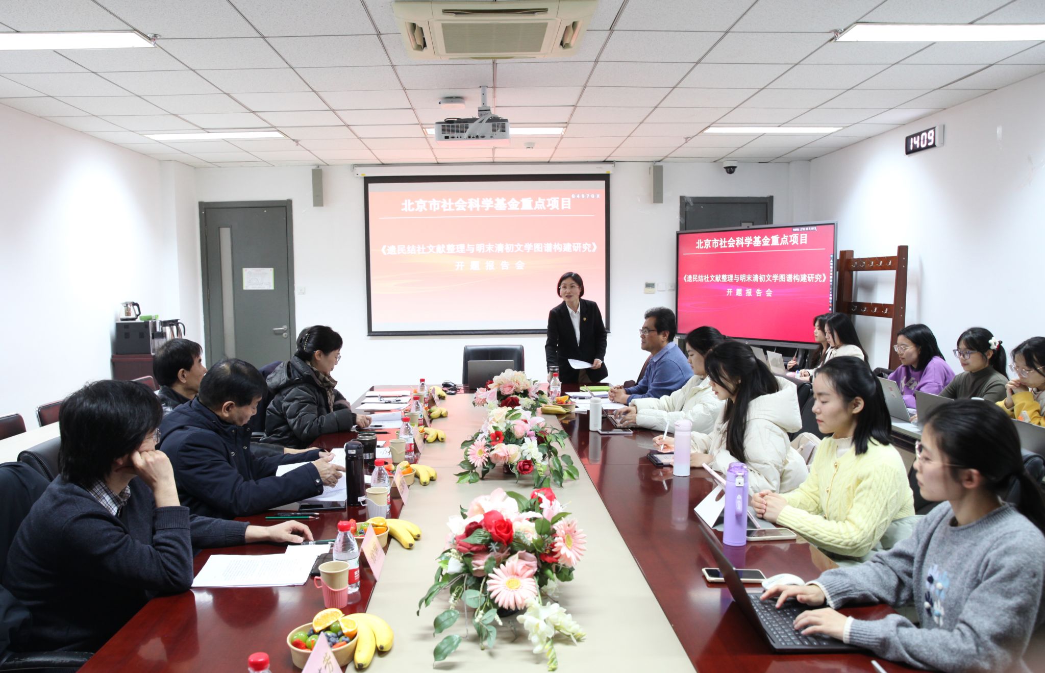 2024年12月26日下午,北京市社会科学基金重点项目《遗民结社文献整理与明末清初文学图谱构建研究》开题报告论证会在金年会jinnianhuicom204会议室举行,该项目负责人为北外中文学院张涛教授。开题报告邀请了北外中文学院名誉院长詹福瑞教授、中国人民大学徐正英教授、北京师范大学杜桂萍教授、首都师范大学左东岭教授、中国人民大学徐楠教授作为专家参与论证,詹福瑞教授担任主持。中文学院党总支书记蔡芝芳以及学院十余名中国古代文学专业研究生参加会议。
